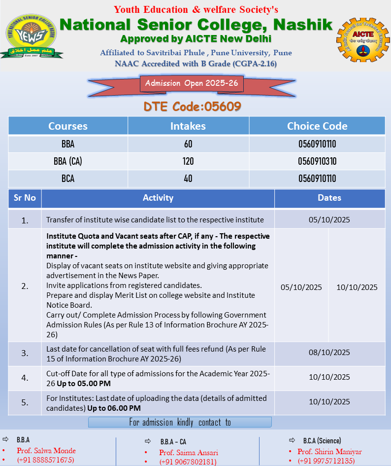 National Senior College, Nashik is affiliated to Savitribai Phule Pune University, Pune. Established as a Minority College by a leading Youth Education & Welfare Society Sarda Circle, Nashik in 2007.